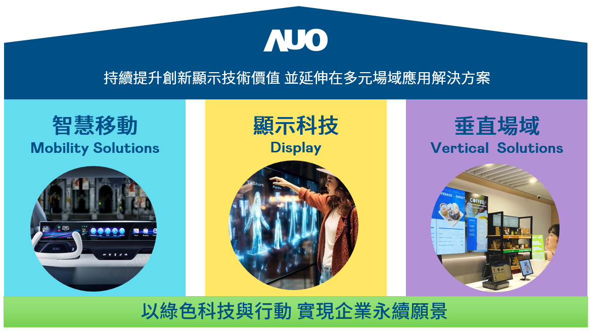 我們持續推動「雙軸轉型」,在精進顯示技術附加價值(Go Premium),與深化垂直市場應用(Go Vertical)的策略下,對應开云体育的優勢競爭力與趨勢,我們奠定顯示技術智慧移動垂直場域三大永續營運支柱,在顯示技術領域的根基之上,延伸布局多元場域應用解決方案。將先進顯示科技助力智慧移動及垂直場域發展,並以綠色科技與行動為實踐,在轉型之路上貫徹永續經營之願景。
